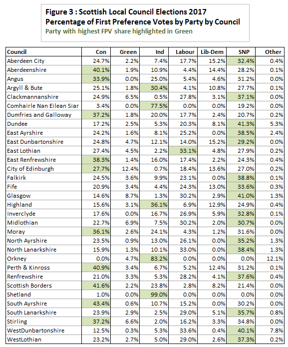 I have highlighted the Party that gained the highest shared of First Preference Votes in each Council. They are SNP 16, Con 10, Ind 5, Lab 1.