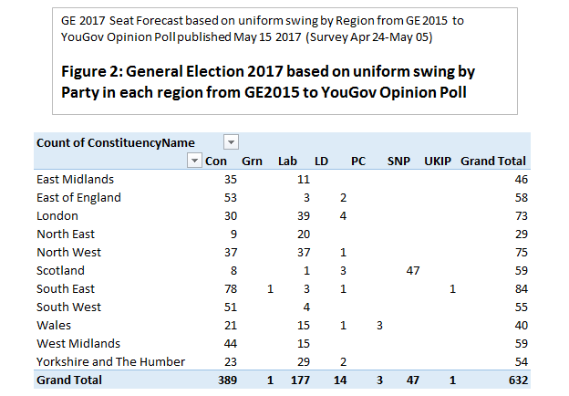 On May 15, YouGov produced a General Election opinion poll broken down by the eleven Regions of Great Britain. It seems impressive with 14395 GB Adults, plus 1040 London Adults, 1017 Scottish Adults and 1018 Welsh Adults. However, with fieldwork on 24 April to 05 May, it might be a little out of date. By combining this with the General Election Results by Constituency (available for the British Election Study) I have been able to produce a crude forecast for the General Election on June 8th.