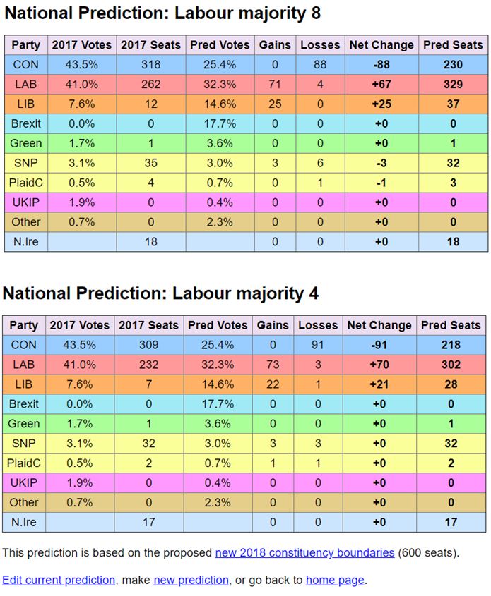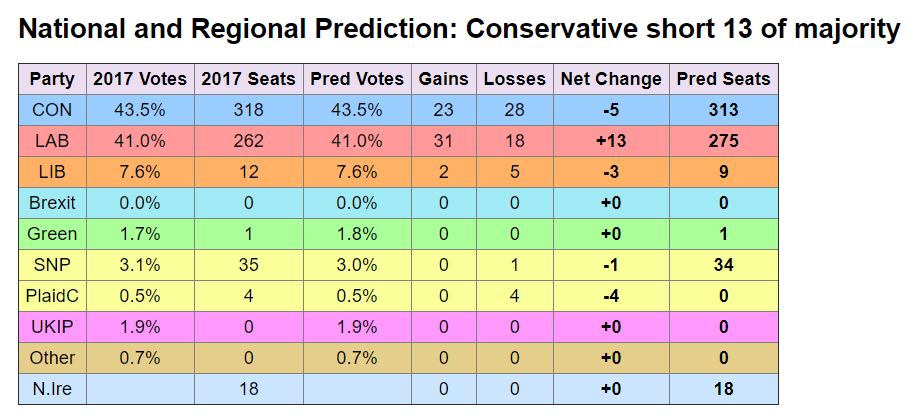 This fairly accurately produces the 2017 result at the top level with a hung parliament. The predictor slightly overstates the Labour seats, fails to predict any seats for Plaid Cymru and understates the Lib-Dem seats for the same reason. That is the support for the parties is more concentrated than the program allows. Plugging in the national results produces the prediction of a small Conservative majority, much for the same reason. The program does not properly allow for concentrated regional or local support.