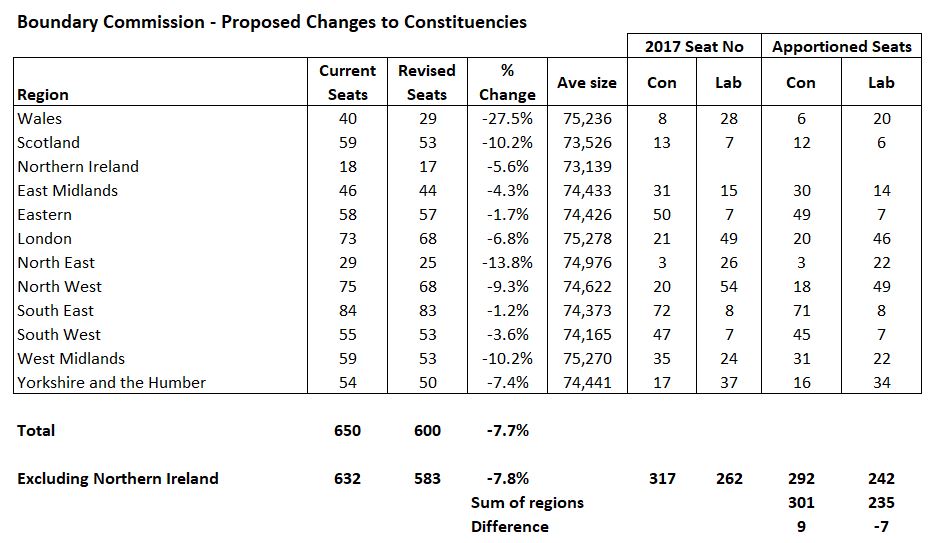 The Boundary Commissions 2018 recommendations, published on 05/09/18 are spread across sites for Wales, Scotland, Northern Ireland and England. Using the results of the 2017 General Election I constructed a table to show the proposed constituency changes by region.