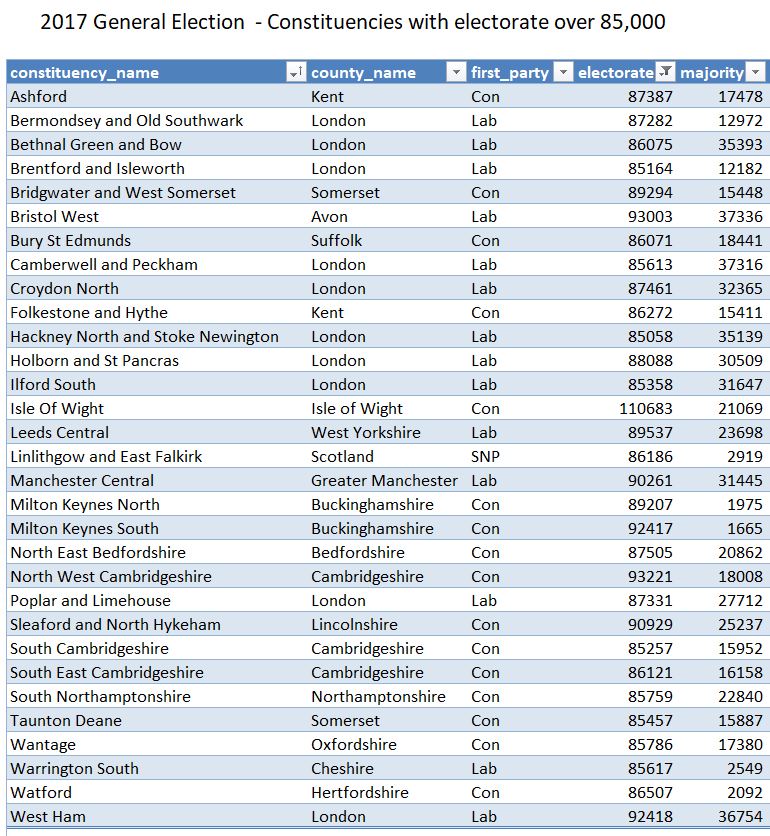 It is now eight years since legislation was passed to reduce the number of constituencies from 650 to 600, along with making them more equal in size. Had the 2017 election been faught on this more level playing field it is most likely that the Conservatives would have been returned with a small majority rather than losing that majority. The impact of enacting the changes would be to counter the relative discrimination that much of the South and East of England has in general elections due to having larger average constituencies. Most of all it would be of benefit to those in the 31 constituencies with over 85,000 voters, listed below.