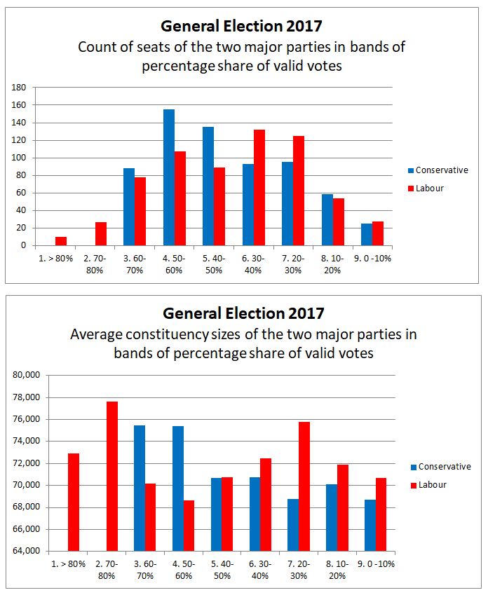 Fig 7 : From the 2017 General Election results, bands of the percentage of valid votes gained by each party. The upper chart is the count of seats in each band. The lower chart shows the average constituency size.