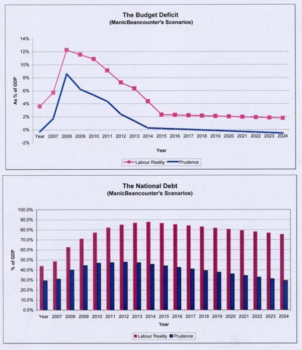 The second issue is the position at the start of downturn. In mid-2008 both USA and Britain had structural deficits – in the USA to finance the wars in Iraq and Afghanistan, in Britain finance a huge increase in public sector pay and capital spending on schools and hospitals. A structural deficit is the measure of the average government deficit over the course of the business cycle. In Britain at the top of the cycle, the actual deficit was around 3% of GDP, with a planned rise to 4%. The structural deficit was probably greater than 4% of GDP in mid-2008 in Britain and maybe slightly smaller in the USA. Below is my estimate of the impact of Britain’s structural deficit in April 2010. I estimated that the structural deficit built up between 2001 and 2008 would in the long-term increase National Debt by 40% of GDP. I was overly optimistic in my assessment.
