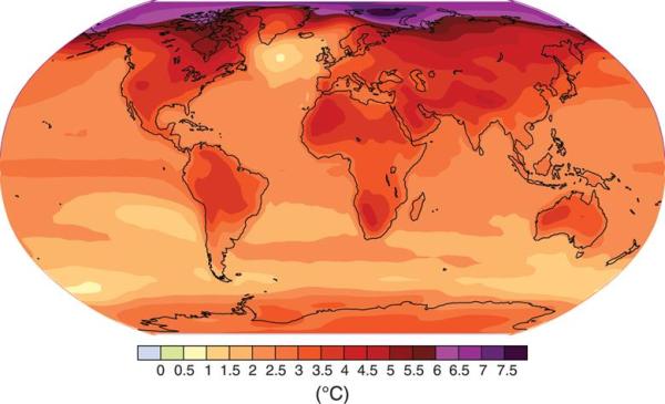 Figure SPM.6. Projected surface temperature changes for the late 21st century (2090-2099). The map shows the multi-AOGCM average projection for the A1B SRES scenario. Temperatures are relative to the period 1980-1999. {Figure 3.2}