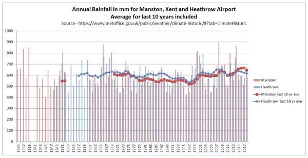 Water availability is not so precise, yet the fall due to climate change of 39 million litres per day is just 7% of existing domestic demand, or 4.3% of total water usage. There are some records at the Met Office of rainfall. In particular in the South East are records for Heathrow Airport and Manston in Kent. I have graphed annual rainfall data, with averages of the last 10 years.