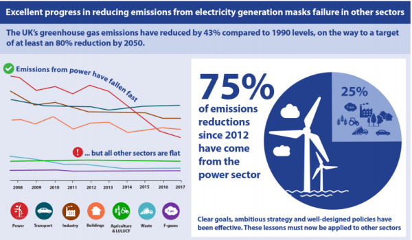 Brazil intends to reduce emissions by a further 2% compared to 2005 levels. Very few targets are more than soft targets relative to current or projected trends. Yet the outcome of COP21 Paris enabled headlines throughout the world to proclaim a deal had been reached “to limit global warming to “well below” 2C, aiming for 1.5C”. It enables most Governments to juggle being key players on a world stage, have alarmists congratulating them on doing their bit on saving the planet, whilst making sure that serving the real needs of their countries is not greatly impeded. It is mostly win-win as long as countries do not really believe that targets are achievable. This is where Britain has failed. Under Tony Blair, when the fever of climate alarmism at its height, backed up by the political spin of New Labour and a Conservative opposition wanting to ditch its unelectable image, Green activists wrote the Climate Change Act 2008 with the strict targets to be passed. Britain swallowed climate alarmism whole, and now as a country that keep its promises is implementing useless and costly policies. But they have kept some form of moderation in policies until now. This is illustrated by a graphic from a Committee on Climate Change report last week “Reducing UK emissions 2018 – Progress Report to Parliament” (pdf) (and referenced at cliscep)