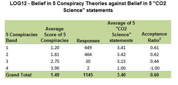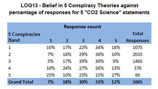 To clarify, the “Grand Total” row shows that there were 366 scores of 1 in the 5 CO2 science statements. Of these 15 were by the 12 respondents who averaged a score of 5 in the conspiracy theories. The proportions I believe can be better seen by the percentage of responses in each row.