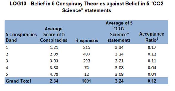 LOG12 had thirteen questions on conspiracy theories and LOG13 nine. In the latter three were on science issues and one on “New World Order”. That left five that are comparable between the papers, but independent of the scientific / political subject matter1.