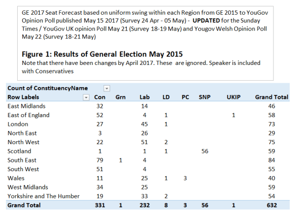 On May 15, YouGov produced a General Election opinion poll broken down by the eleven Regions of Great Britain. It seems impressive with 14395 GB Adults, plus 1040 London Adults, 1017 Scottish Adults and 1018 Welsh Adults. However, with fieldwork on 24 April to 05 May, it might be a little out of date. By combining this with the General Election Results by Constituency (available for the British Election Study) I have been able to produce a crude forecast for the General Election on June 8th.