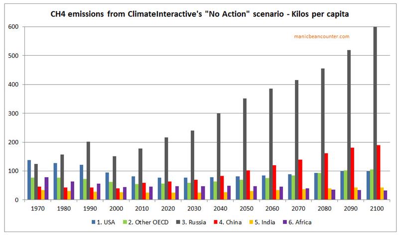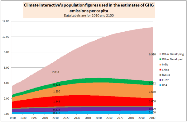 China has recently had phenomenal growth rates. According to UN data, from 1990 to 2012, economic growth averaged 10.3% per annum and CO2 emissions 6.1%. In the not too distant future economic growth will slow as per capita income approaches rich country levels, and emissions growth will slow or peak. But the Climate Interactive forecast has total emissions only peaking in 2090. The reason for China’s and Russia’s forecast per capita emissions exceeding those of the USA is likely due to a failure to allow for population changes. In USA population is forecast to grow, whilst in China and Russia population is forecast to fall.