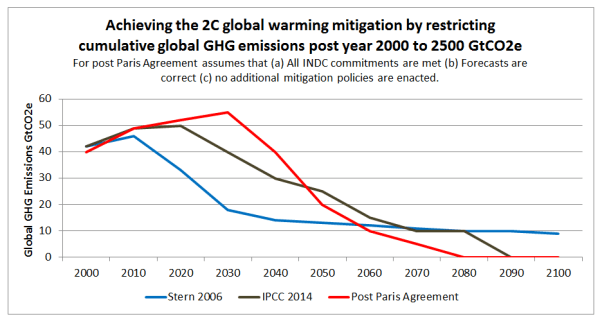 The INDCs have the capability of limiting the forecast temperature rise to around 2.7 degrees Celsius by 2100, by no means enough but a lot lower than the estimated four, five, or more degrees of warming projected by many prior to the INDCs