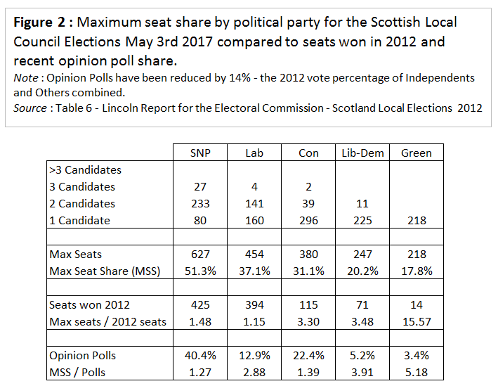 Although there are clear differences in voting patterns between the European Elections and the General Elections, it is clear that from the above analysis for either the Conservative or Labour Parties to stand a chance of getting a majority, they must regain voters lost to other parties in the European Elections. Some voters will move back anyway, and much higher turnout in General Elections will have a role to play. But opionion polls in the last two weeks show that we may have four UK-wide parties in play, with the Greens making up a significant fifth. Fig 2, extracted from Britain Elects, summarizes these polls.