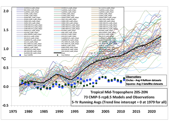 The climate models that the UNIPCC relies upon for temperature and sea rise levels are themselves extreme. Last year Dr Roy Spencer charted 73 climate model predictions of temperature rise against the actual data for over the last 30 years.