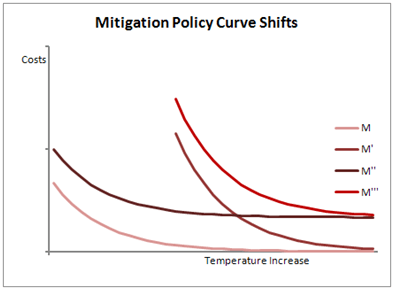 If we fail to optimize then policies like Cap and Trade will generate marginal costs much higher than planned. The curve shifts to the right. If the research for new low-cost carbon neutral energy consumption fails, then the curve shifts upward as we waste money. So overall, sub-optimal policy choice will shift the curve upwards and to the right.
